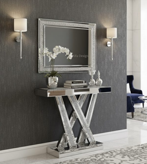 - Luxurious Console Table and Mirror Set: Includes a mirrored console table wall mirror, both designed to brighten and enhance your living space. The unique geometric shape and crushed diamond inlay not only highlights the nobility of the furniture, but also gives a sense of the classic beauty of the years precipitation.