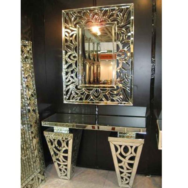 - Size 42″ inch Silver Mirror Console Table with 48 x 30 inch Mirror, Luxurious Console Table and Mirror Set: Includes a mirrored console table wall mirror, both designed to brighten and enhance your living space. The unique geometric shape and crushed diamond inlay not only highlights the nobility of the furniture, but also gives a sense of the classic beauty of the years precipitation.