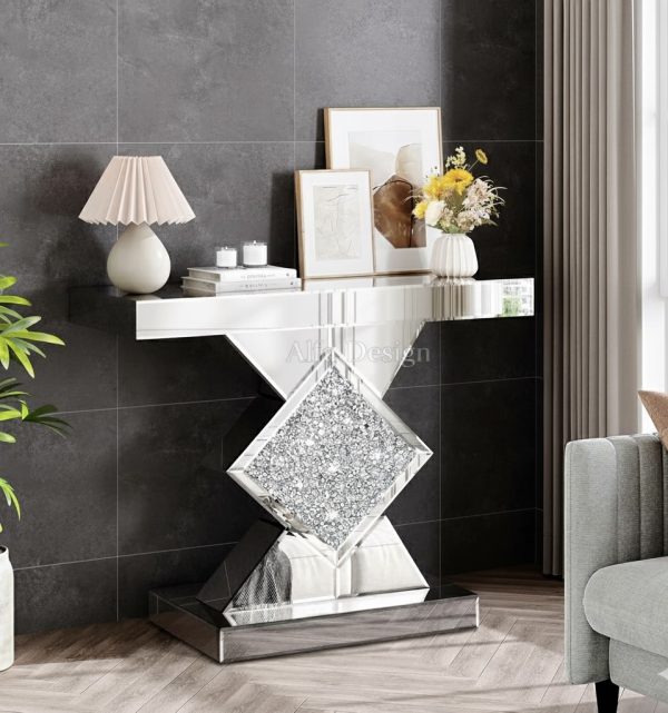 - Size 11.4″D x 31.5″W x 30″H, Luxurious Console Table : Beautiful Appearance: Featuring a HD silver mirror finish and luxurious elements of sparkling diamonds, this mirrored console table is a beautiful addition to any of your rooms. It is sure to impress