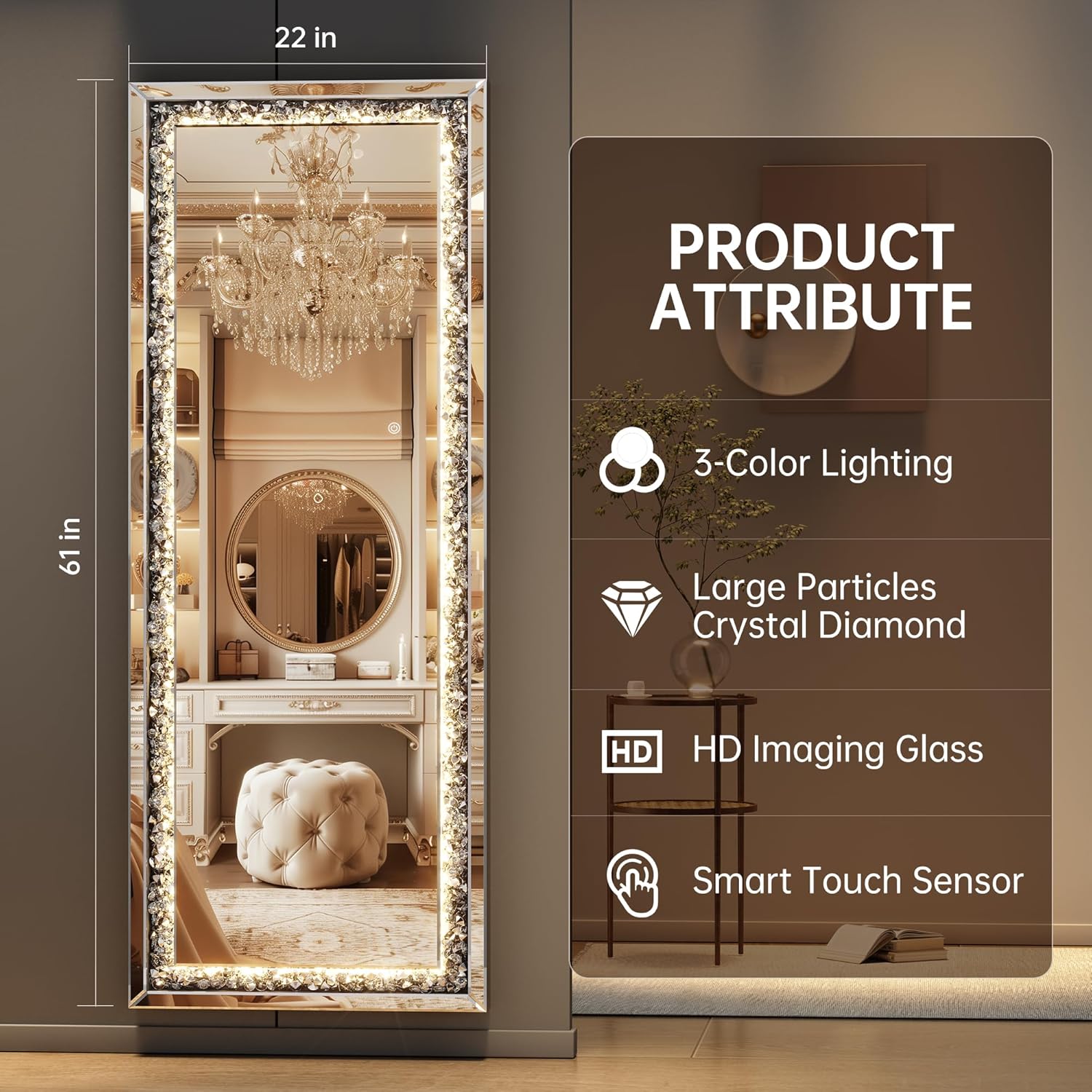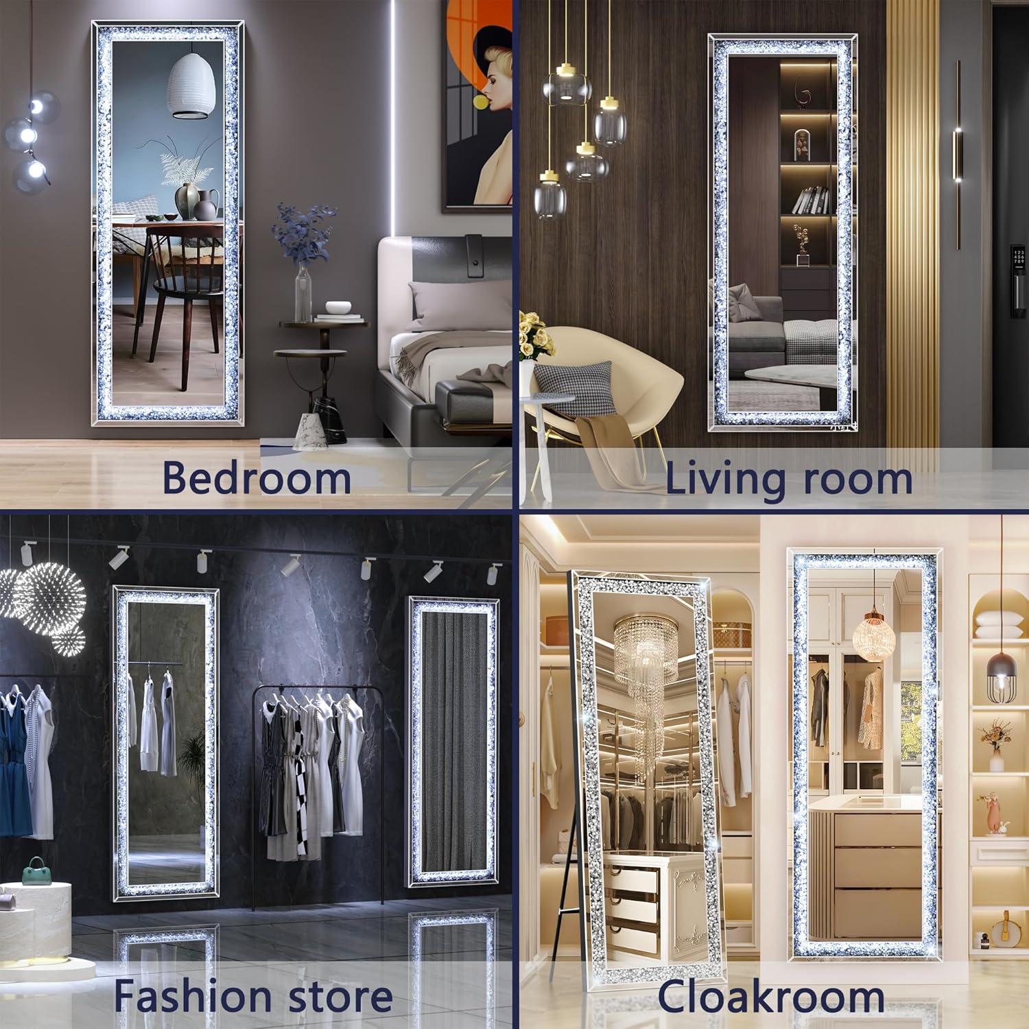- 【SELECTED MATERIAL】:LED Full-length mirror is made of acrylic crystal crush diamond, polished HD glass and solid MDF wood back. The high-quality material make the mirror seems more high-graded and more sturdy. Its large reflective surface that can project light around the room, making it easy to brighten your home and give a better sense of light and space .