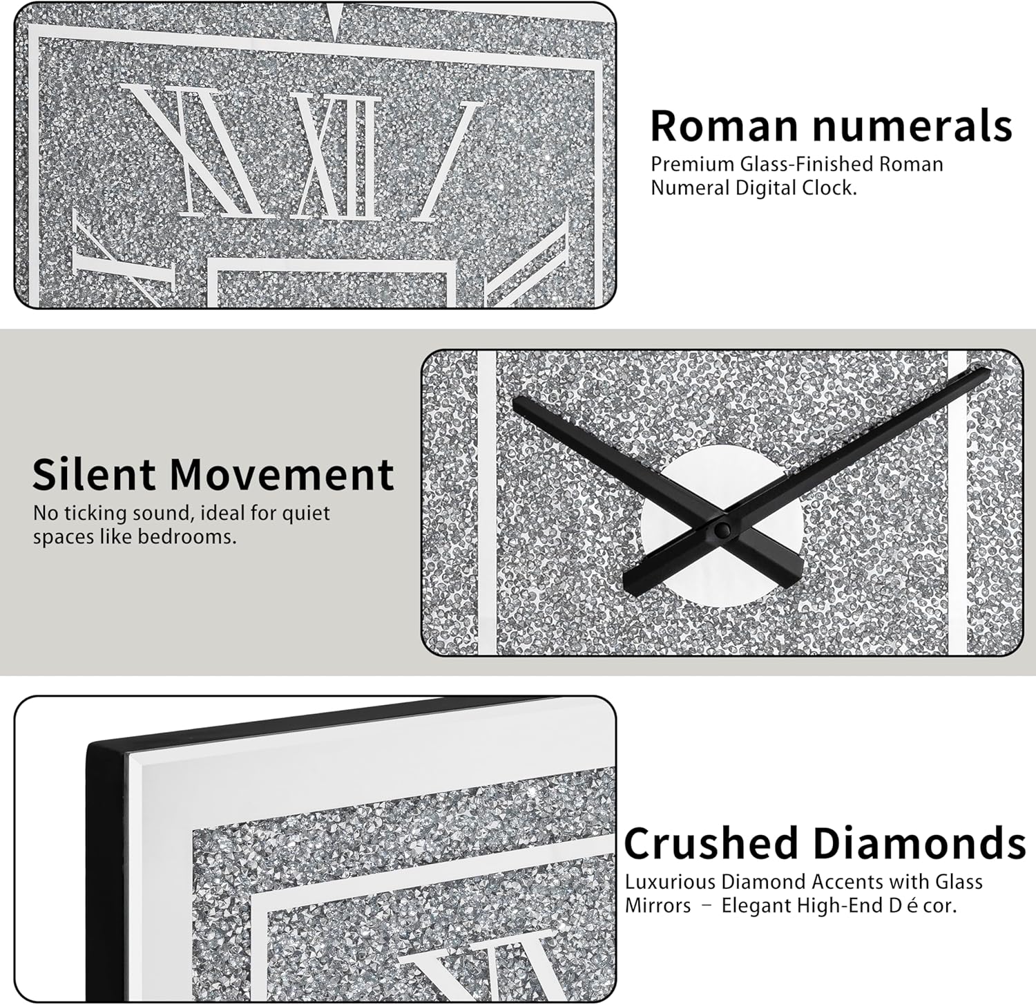 - PRACTICAL HOME DECORATION: Unique wall clocks can not only be used to tell the time, but also with modern and gorgeous decorations, the crushed diamond mirror clock will add shiny and sparkling elements of life to your home, perfect for farmhouses, lofts, cafes, pubs, restaurants, corridors, garages, kitchens, bedrooms, living rooms, schools, and offices decor. Enjoy the admiring glances from your guests!